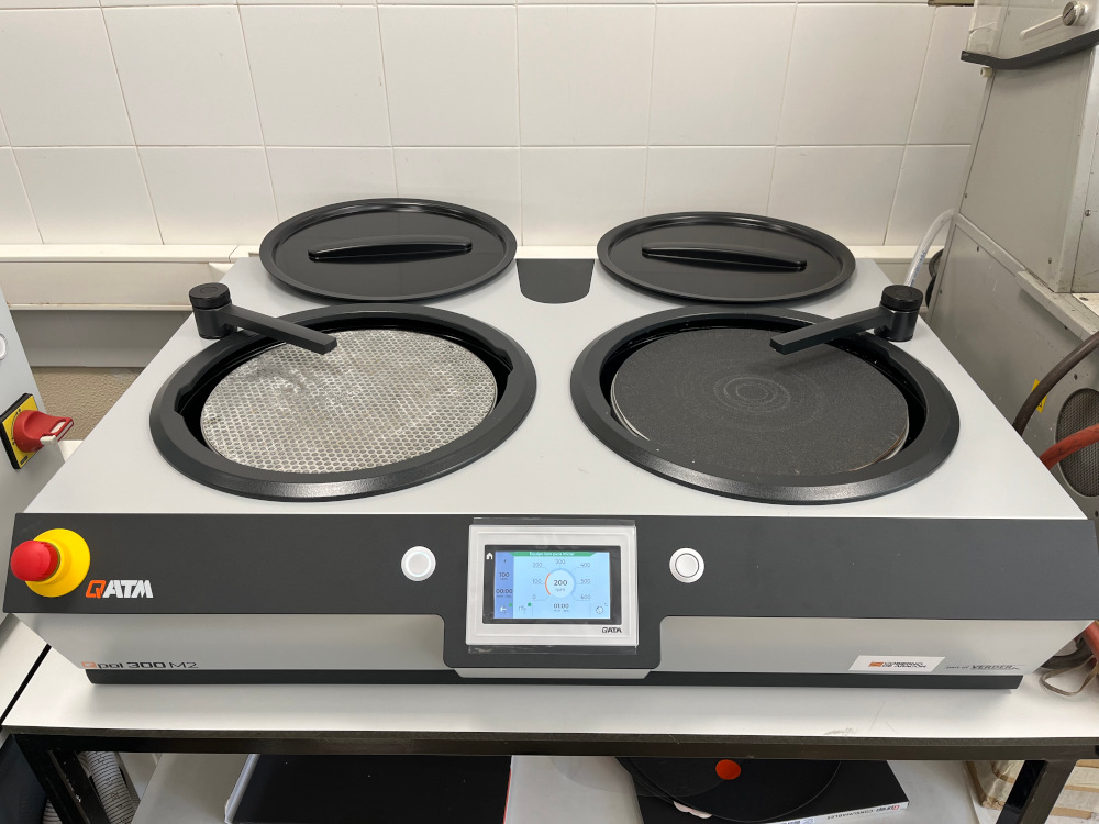 Este equipo de pulido QPol 300 M2 consta de dos platos giratorios independientes con baja generación de ruido y un equipo de sedimentación para reducir la emisión de partículas.